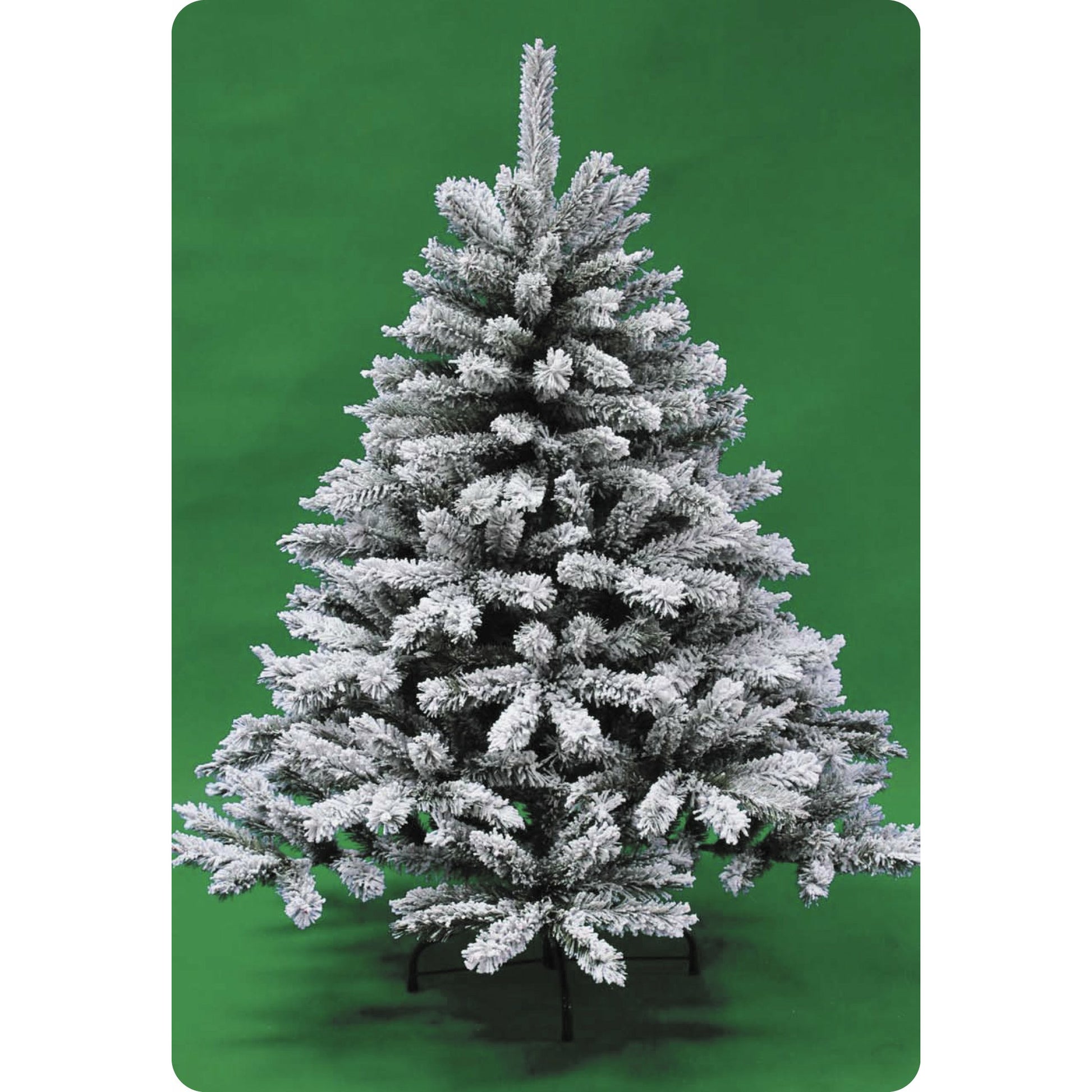 A deep green tree with white frosted tips, creating a beautiful luxe snowy look.